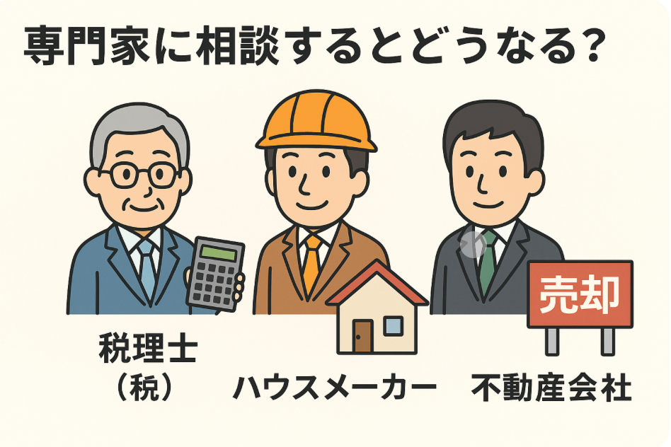 たとえば、税理士は税金面(節税・共同名義にしましょう)ハウスメーカーは建築面(アパートを建てましょう)不動産会社は仲介売却面(売りましょう)と限られることが多く、全体を見据えた最適な提案にまではつながらないケースがあります。
